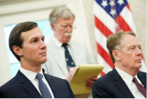 左起为特朗普总统的女婿、高级顾问贾里德-库什纳。国家安全顾问约翰•博尔顿和美国贸易代表。罗伯特-莱特希泽听着总统在椭圆形办公室的讲话,2018年8月27日
