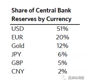 关于美元,最常被问到的问题是:“如果没有很好的替代货币来替代它,美国怎么会失去其储备货币地位?” 因此,让我们更仔细地研究这个问题。 储备货币资产及其在当前持有的外汇储备中所占的百分比如下: