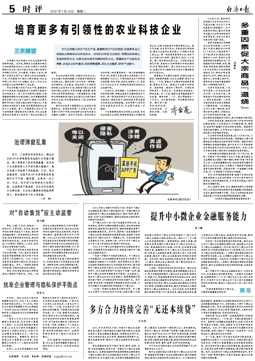 现代农业是资本密集型行业,也是技术密集型行业。我国是世界第一大农药生产国、世界第二大种子市场,但我国种业和原创农药企业整体上规模小、技术水平较低。原创农药企业每年投入研发费用较高,一般占总销售额的9%至13%,我国大多数农药企业研发投入仅占销售额的1%至2%。尽管我国农业生产用种安全有保障、风险可控,但种业创新的人才、成果大多不在企业手中,实质性科技领先的种业企业屈指可数。