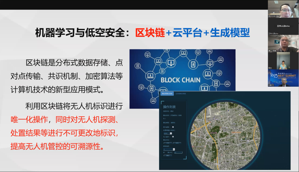 在介绍基于人工智能的低空安全信息研究时,帅博详细介绍了机器学习和区块链技术的应用。他提到了利用区块链技术对无人机进行唯一标识和溯源的方法,以及如何通过云平台和深度学习模型实现无人机的智能管控。